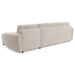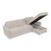 Pod szezlongiem znajduje się przestronny pojemnik wykończony w środku białą płytą. To miejsce na pościel, koce czy sezonowe tekstylia – zawsze pod ręką, bez utraty stylu narożnika.
