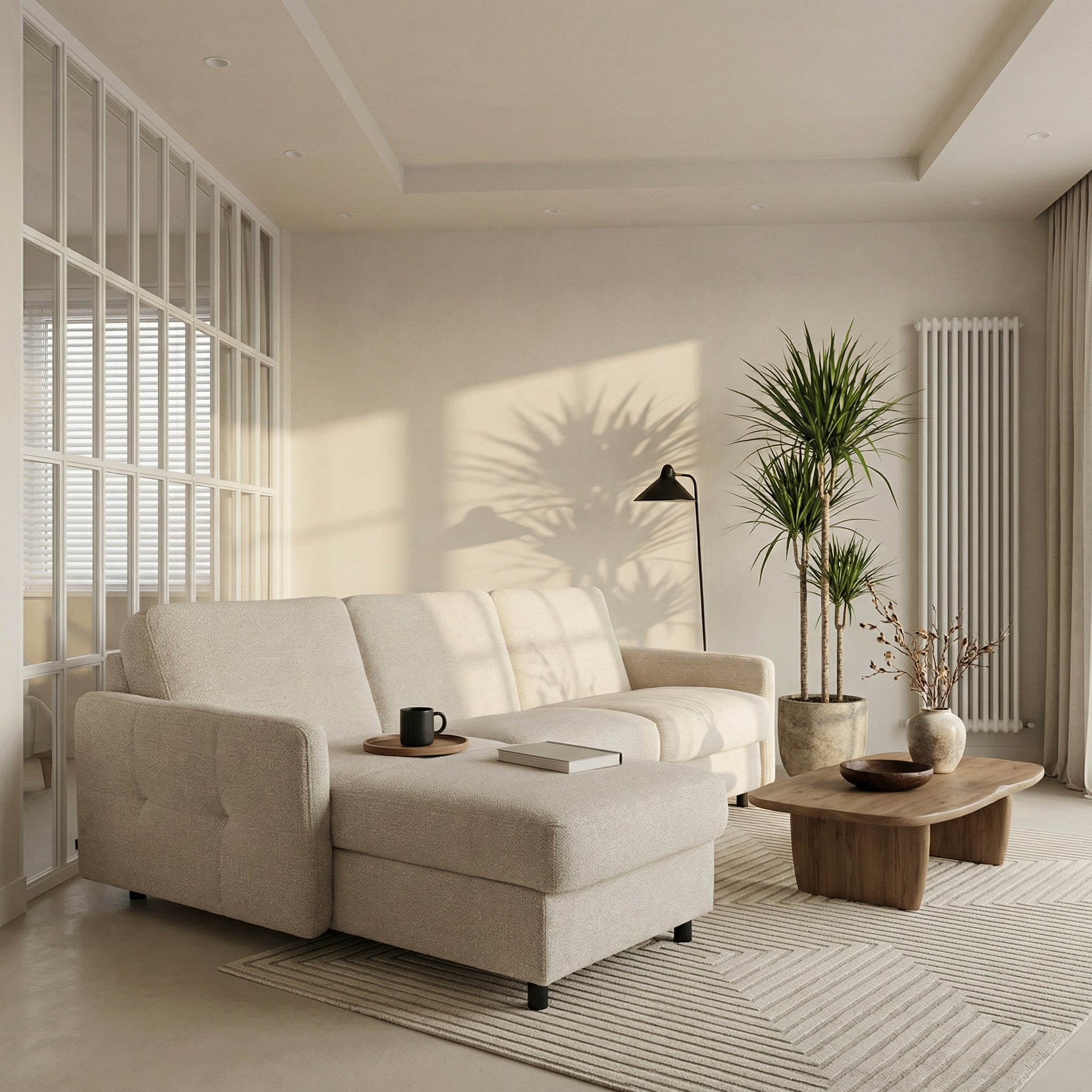 Narożnik EMA z funkcją spania codziennego stelaż włoski z materacem 140 cm i pojemnikiem na pościel