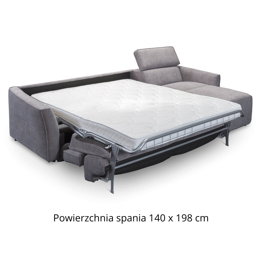 Narożnik NOLA z funkcją spania codziennego stelaż włoski z materacem 140 cm i pojemnikiem na pościel