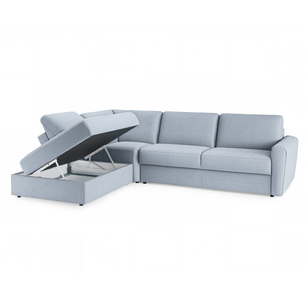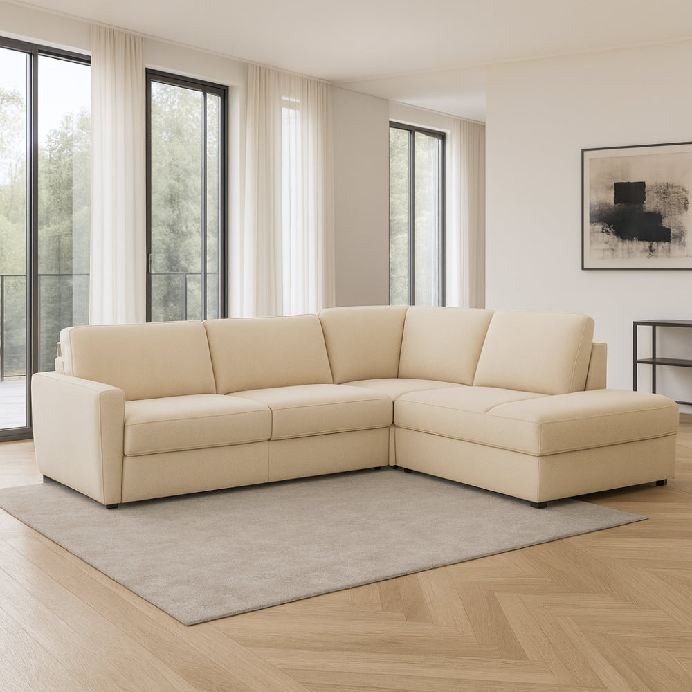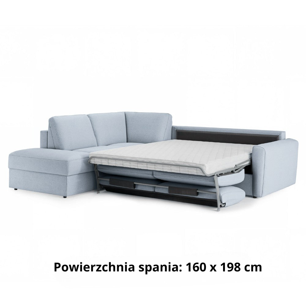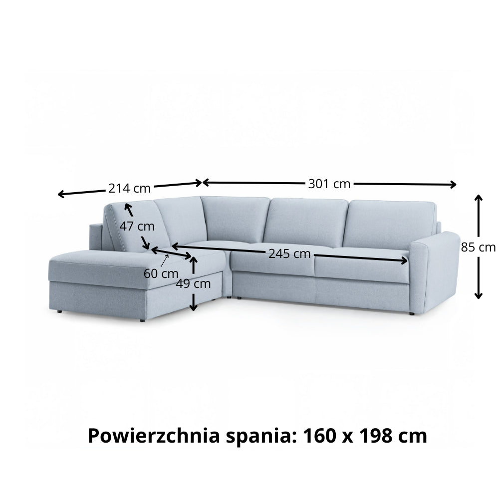 Narożnik DOLLY z otomaną funkcja spania codziennego stelaż włoski z materacem 160 cm i pojemnikiem na pościel