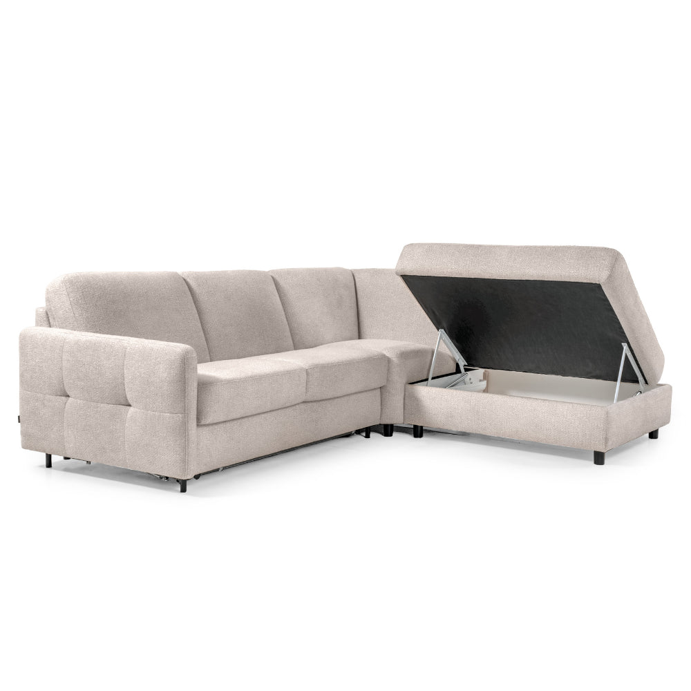 Narożnik EMA z otomaną funkcja spania codziennego stelaż włoski z materacem 160 cm i pojemnikiem na pościel