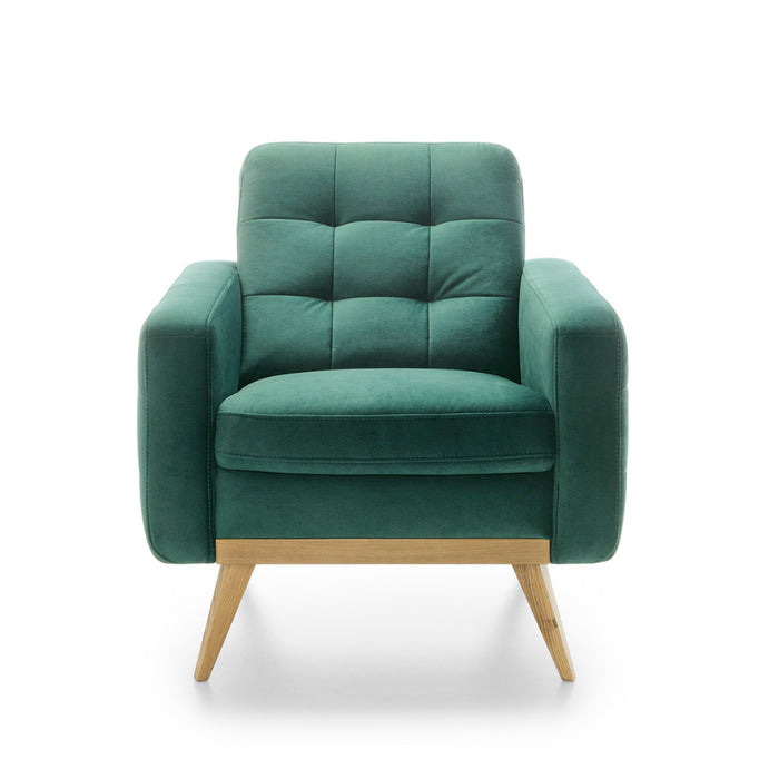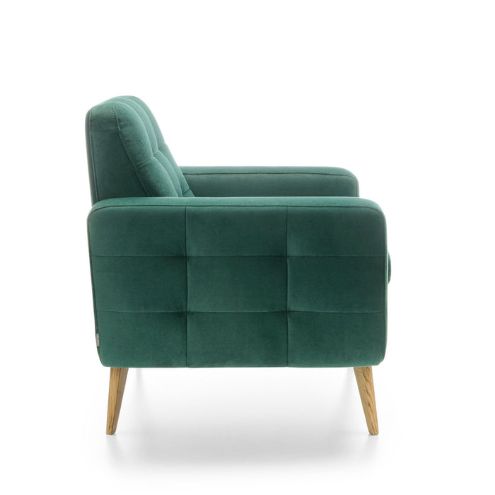 Fotel Nova osadzony jest na wysokich, drewnianych nogach, które dodają mu wizualnej lekkości. Drewniana listwa w dolnej części nie tylko podkreśla styl mebla, ale również nawiązuje do naturalnych materiałów wykorzystywanych w stylu skandynawskim. Delikatne pikowania na bokach i oparciu dodają całości elegancji.