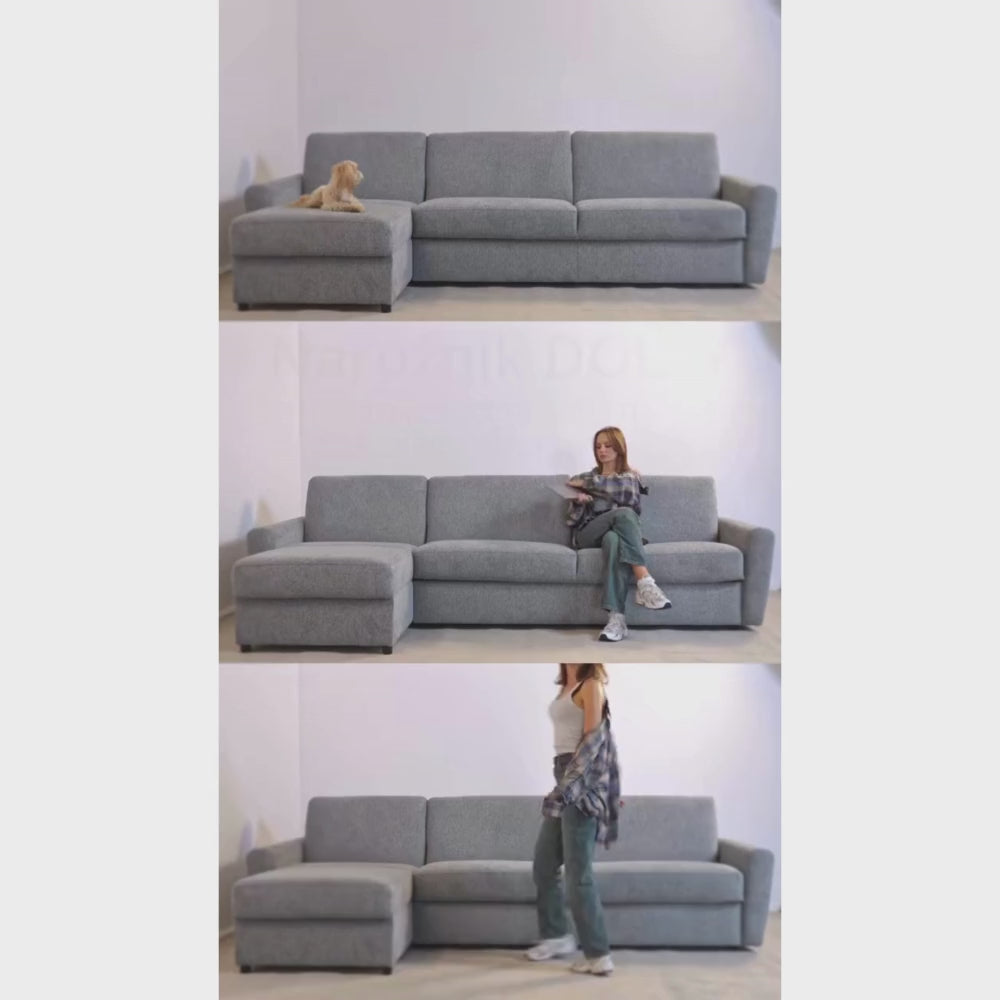 Narożnik DOLLY z funkcją spania codziennego stelaż włoski z materacem 140 cm i pojemnikiem na pościel prawostronny